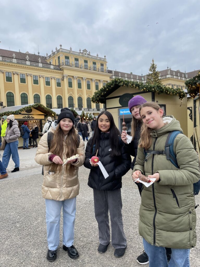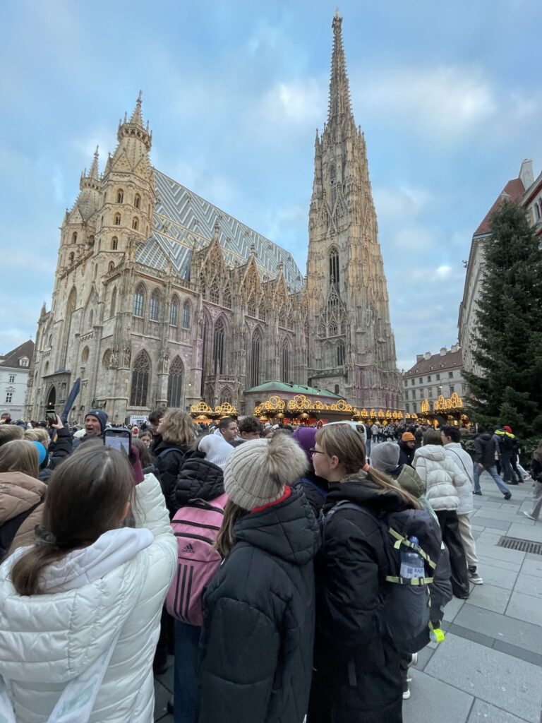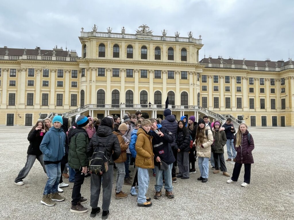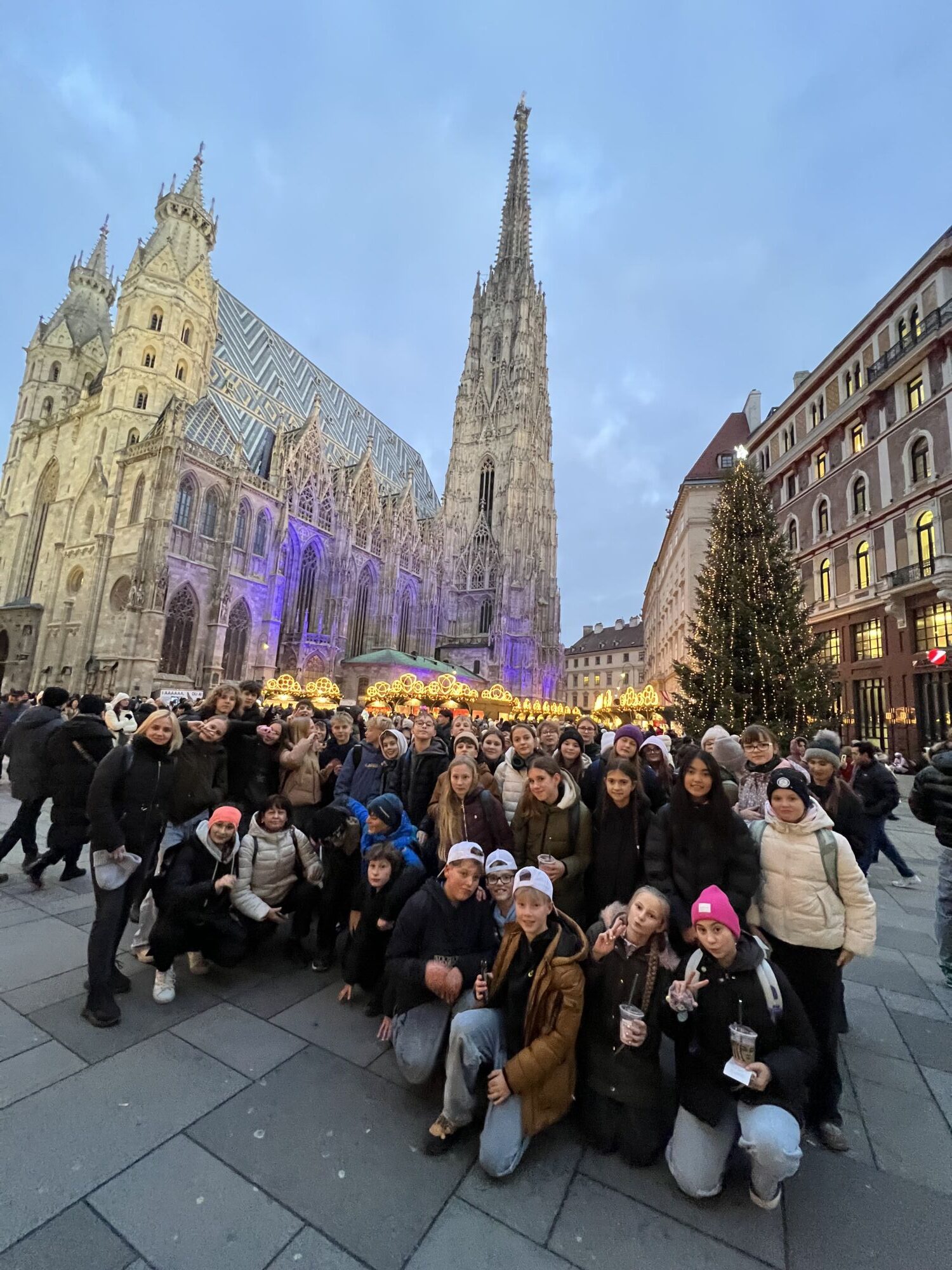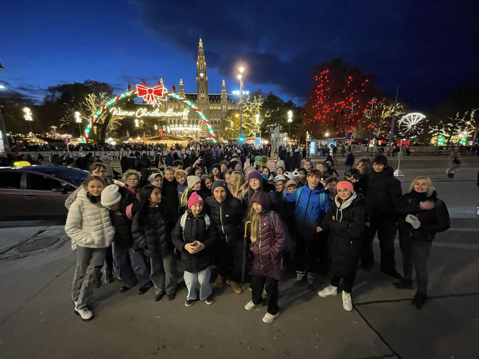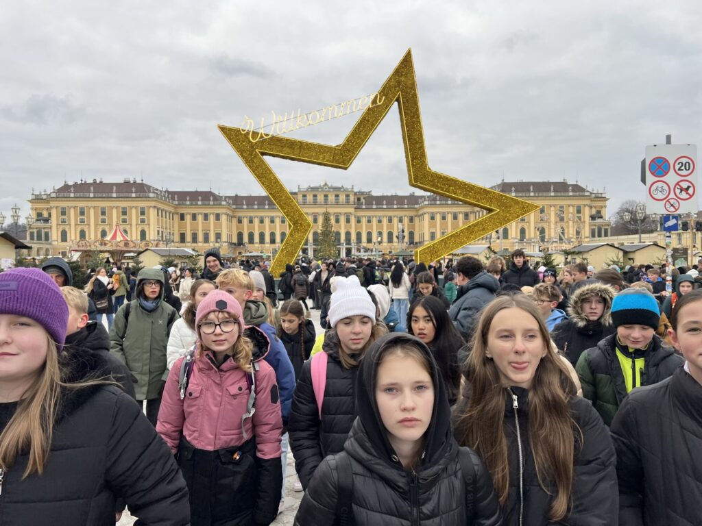 Ve čtvrtek 27. listopadu jsme vyrazili se 6. A a 7. B do adventní Vídně a už hned ráno jsme pochopili, že to nebude obyčejný školní výlet. Naší první zastávkou byl Schönbrunn, jeden z nejslavnějších zámků v Evropě. Prošli jsme se zimními zahradami, viděli honosnou fasádu císařské rezidence a představovali jsme si, jak tudy kdysi chodila Marie Terezie. Adventní trhy na nádvoří tomu dodaly ještě lepší atmosféru — vůně, výzdoba a stánky mezi historickými budovami vypadaly opravdu kouzelně.