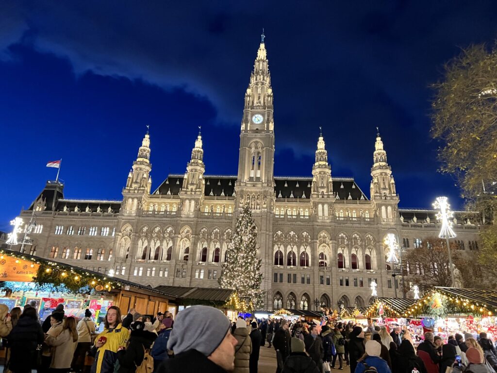 A pak přišel úplný vrchol adventní části dne — trhy před radnicí. Po setmění se celé náměstí proměnilo ve vánoční pohádku. Vzduchem se nesla vůně pečených mandlí a koření, stánky svítily teplými barvami, kluziště se lesklo pod světly a nad tím vším stál obrovský smrk z Tyrolska, který se v noci mění v romantický symbol celého adventu.