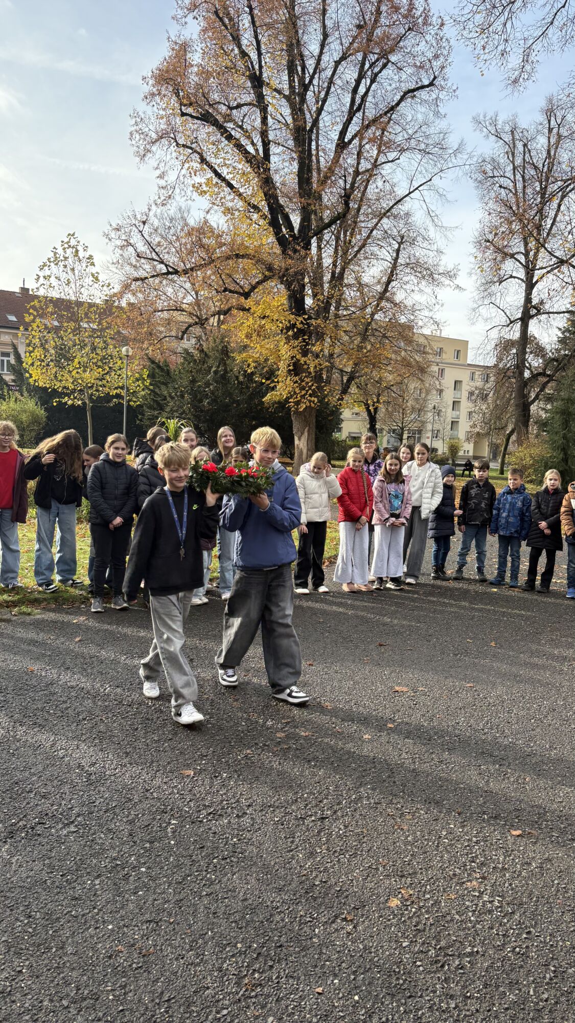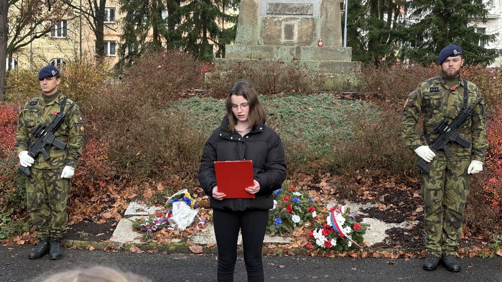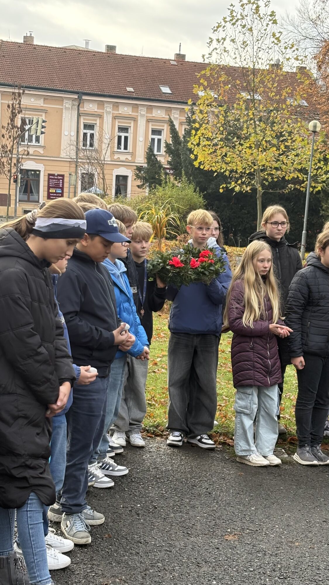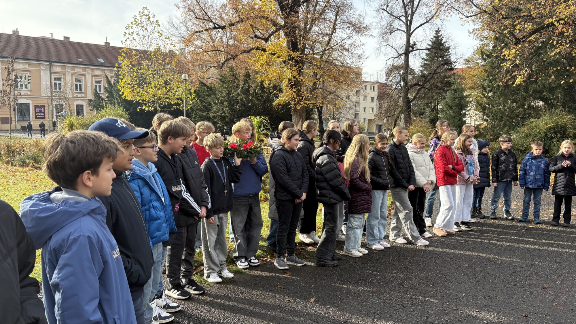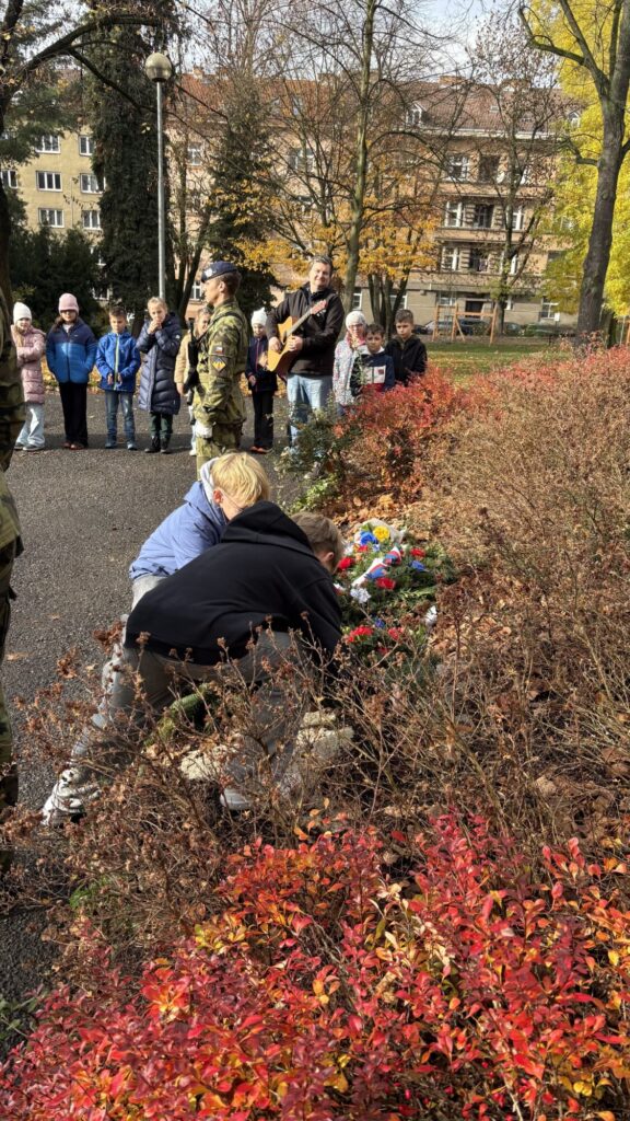 V úterý 11. listopadu si naše škola tradičně připomněla Den válečných veteránů, který je věnovaný památce ukončení 1. světové války. U pomníku na Mírovém náměstí, který střežili vojáci Armády České republiky, jsme položili věnec z vlčích máků, kamínky pomalované stejným symbolem a zazpívali píseň Ach, synku, synku a na závěr naši státní hymnu.