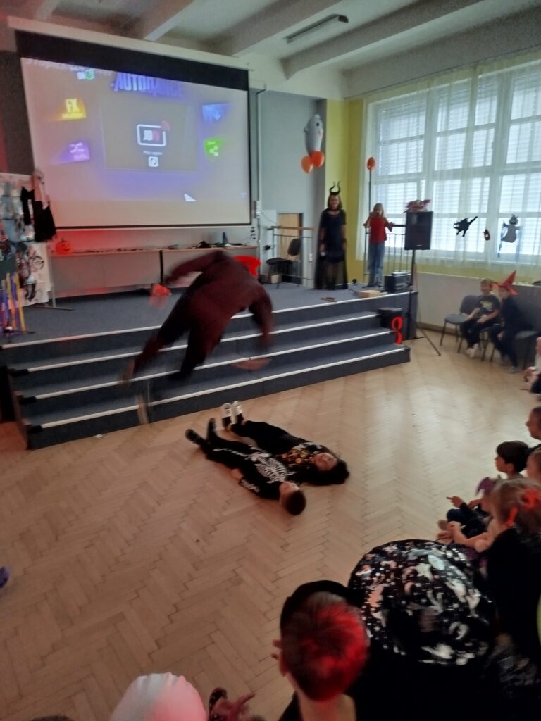 Z auly se stalo místo plné tajemných bytostí – po parketu se pohybovali duchové, čarodějnice i kostlivci a také dvě tajemné postavy, které vzbuzovaly zvědavost všech přítomných. O překvapení se postarala třetí maskovaná postava, která se objevila v závěru této akce. Ta nám předvedla úžasné parkourové kousky, které nás všechny nadchly. Poté se děti snažily přijít na to, kdo se pod maskami těchto tajemných bytostí skrývá.