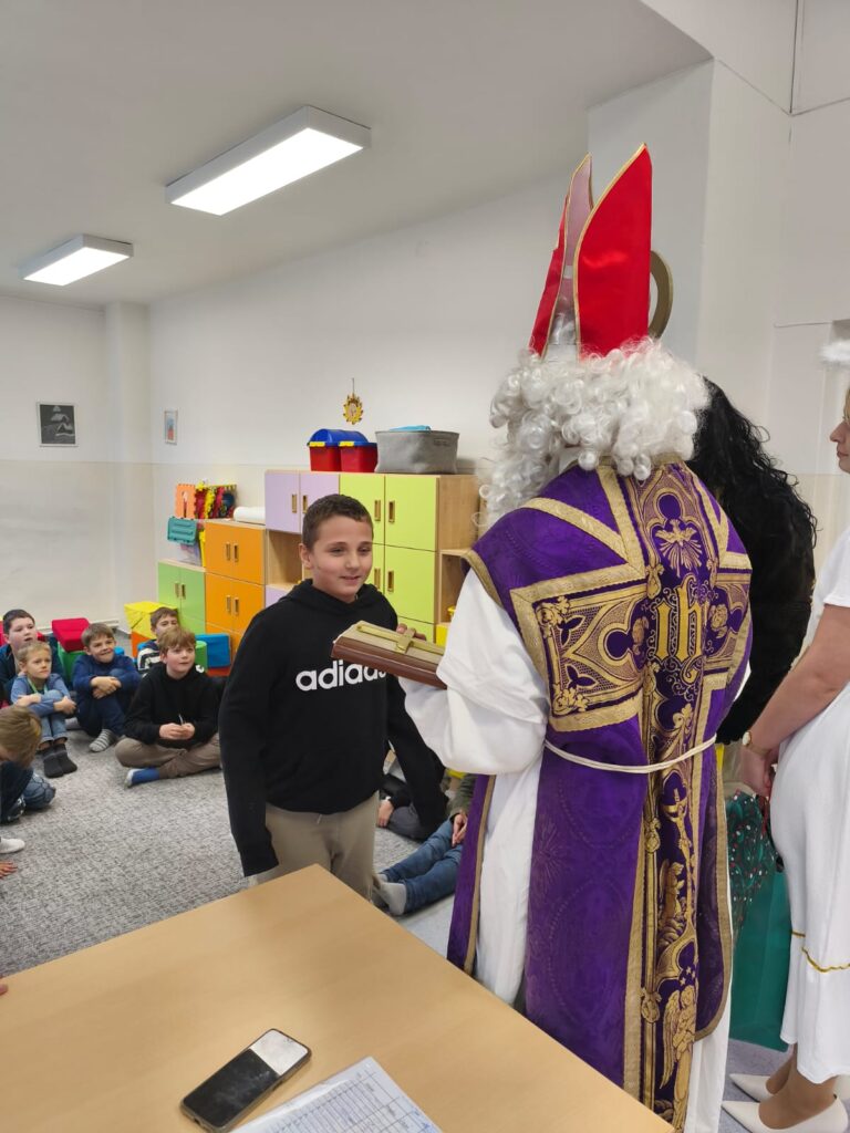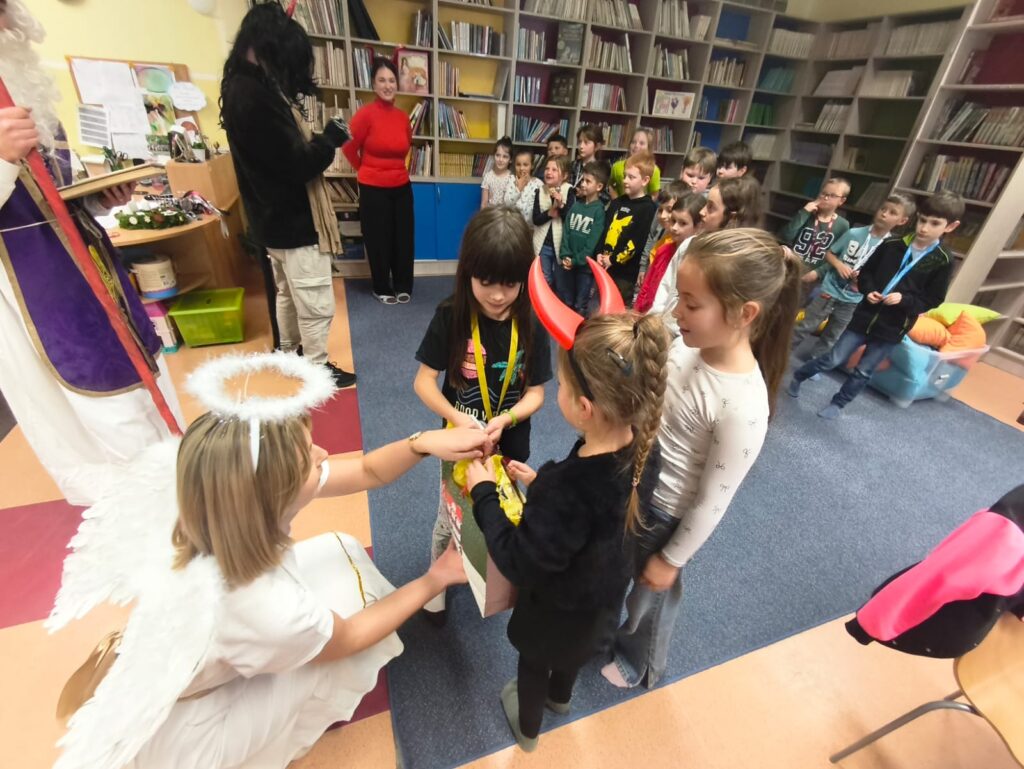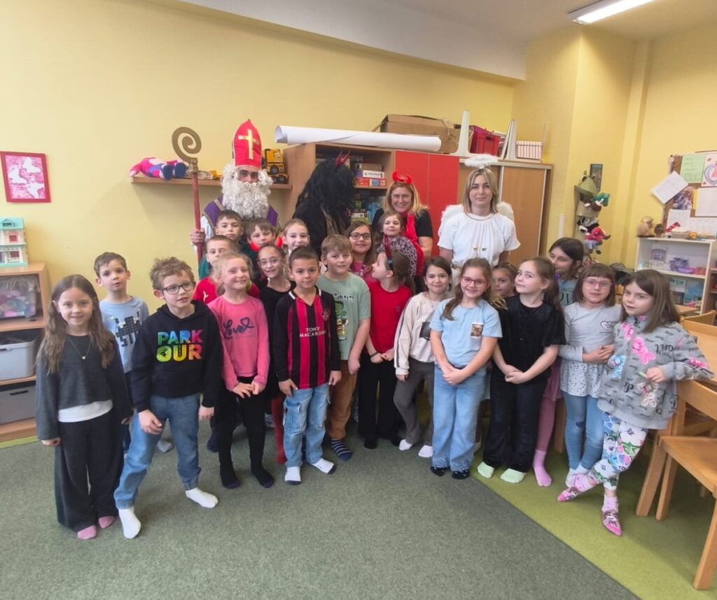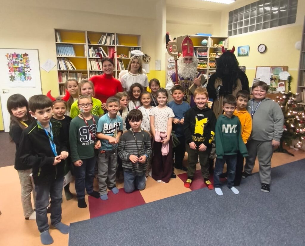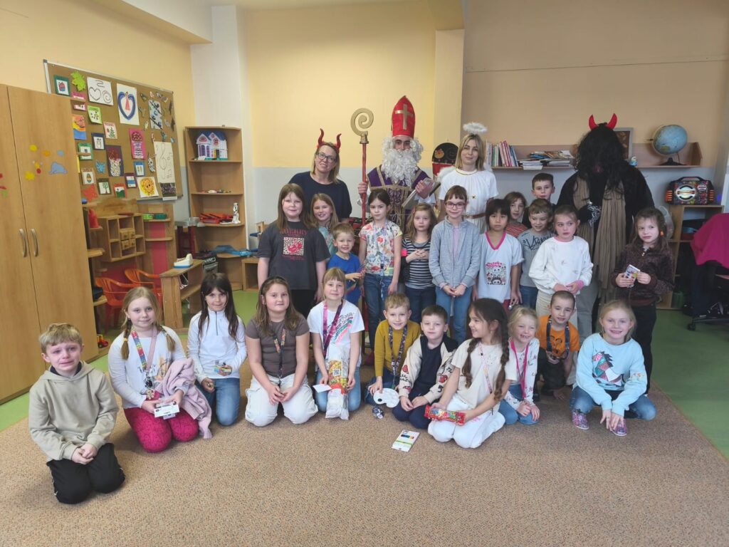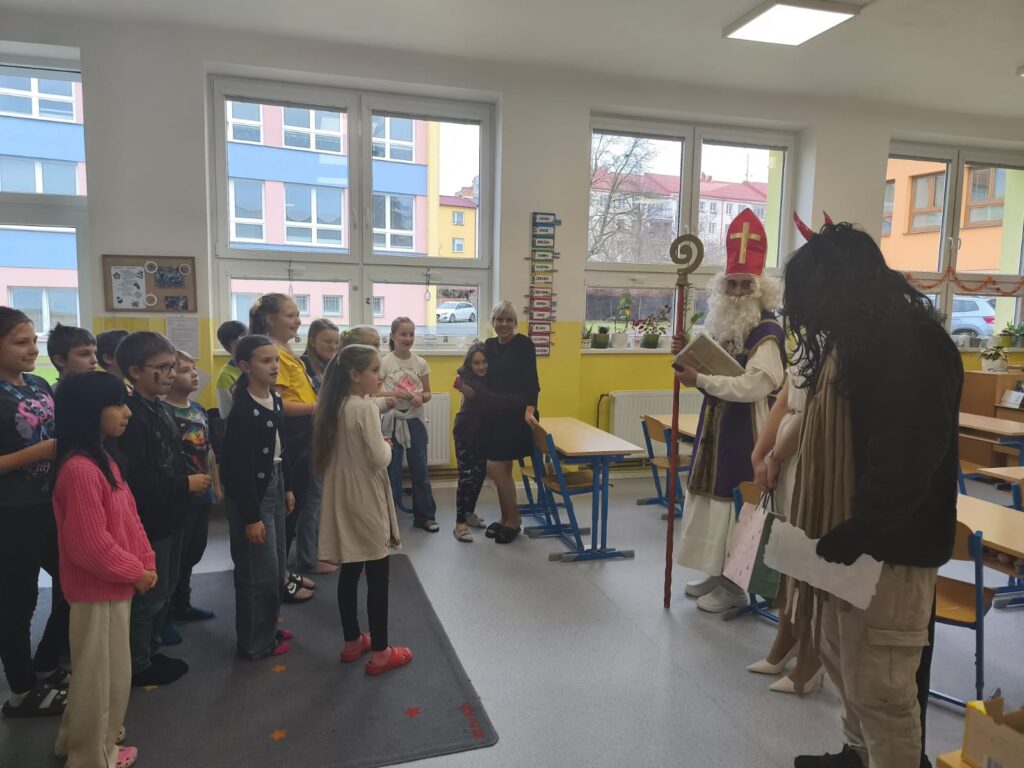 V pátek 5. prosince navštívili naši školní družinu Mikuláš, anděl a čert. Atmosféra byla sváteční už od začátku týdne, kdy do jednotlivých oddělení dorazily dopisy – některé od Mikuláše, jiné od samotných čertů. Děti si je s nadšením četly a těšily se na velký den.