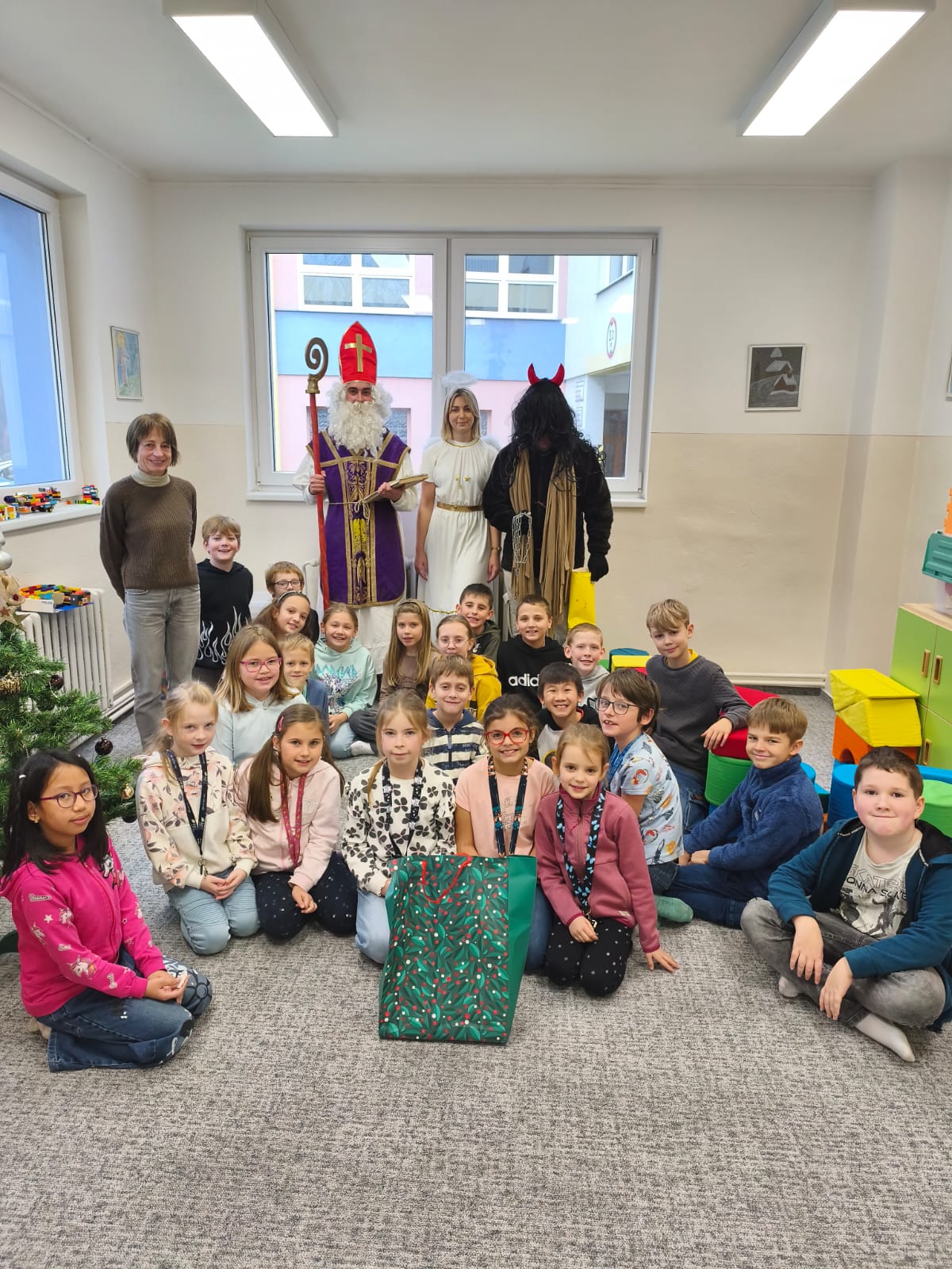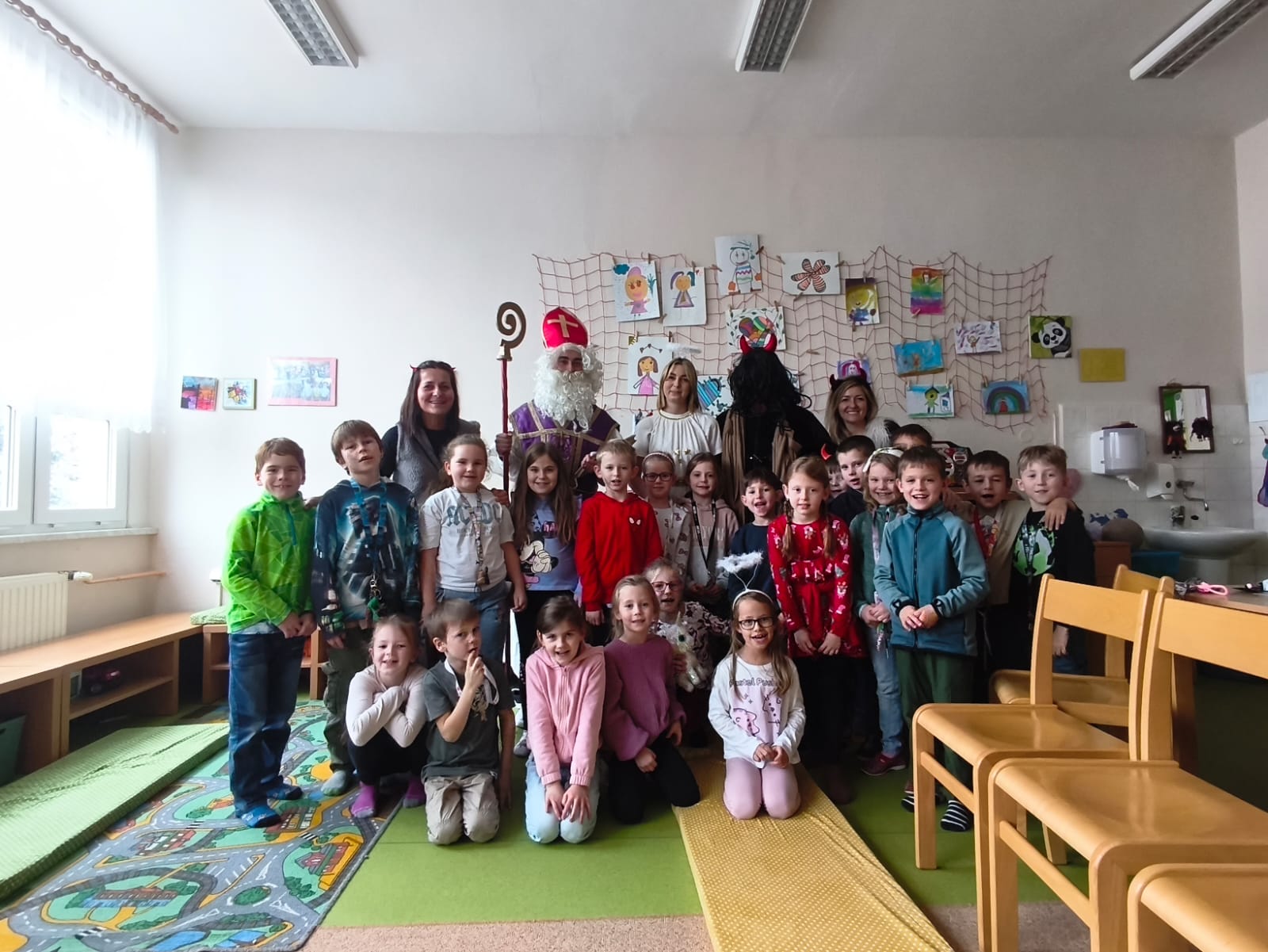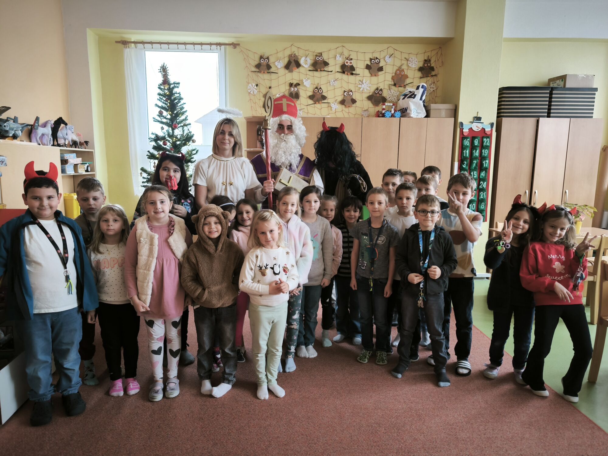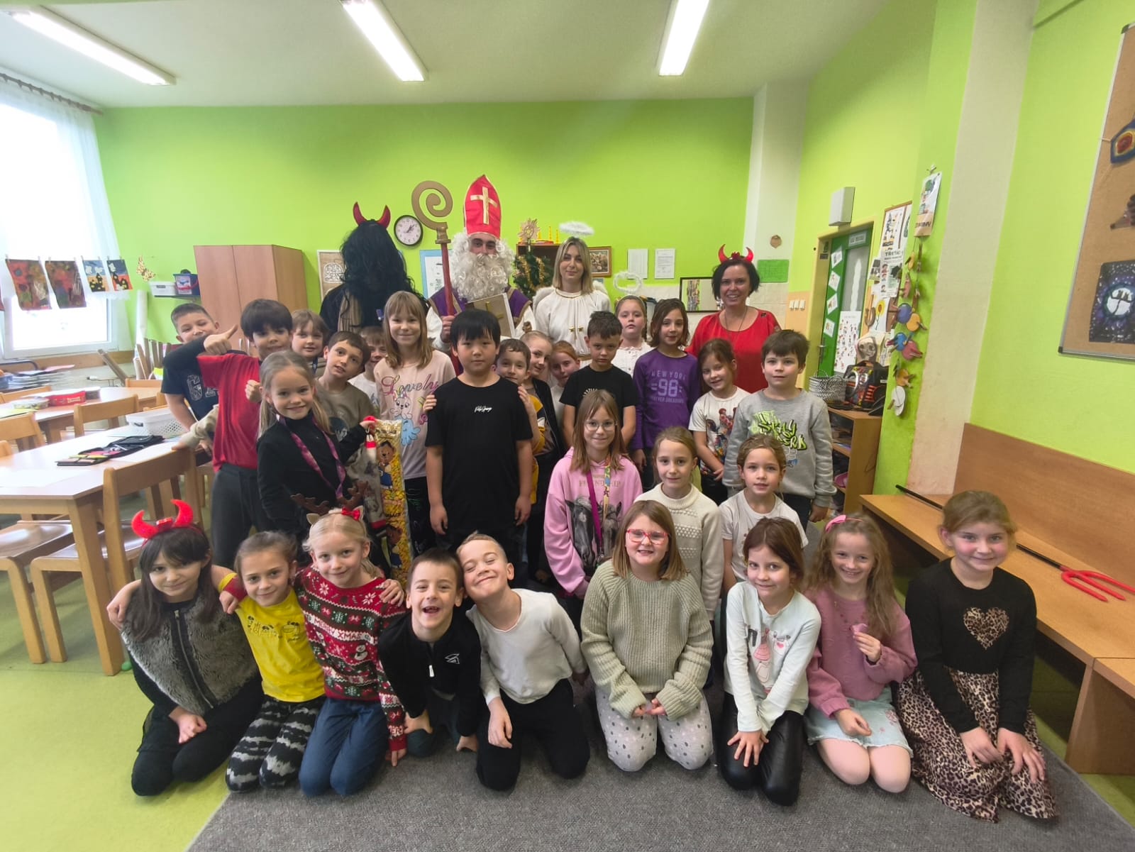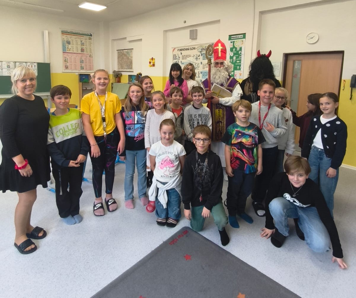 V pátek 5. prosince navštívili naši školní družinu Mikuláš, anděl a čert. Atmosféra byla sváteční už od začátku týdne, kdy do jednotlivých oddělení dorazily dopisy – některé od Mikuláše, jiné od samotných čertů. Děti si je s nadšením četly a těšily se na velký den.