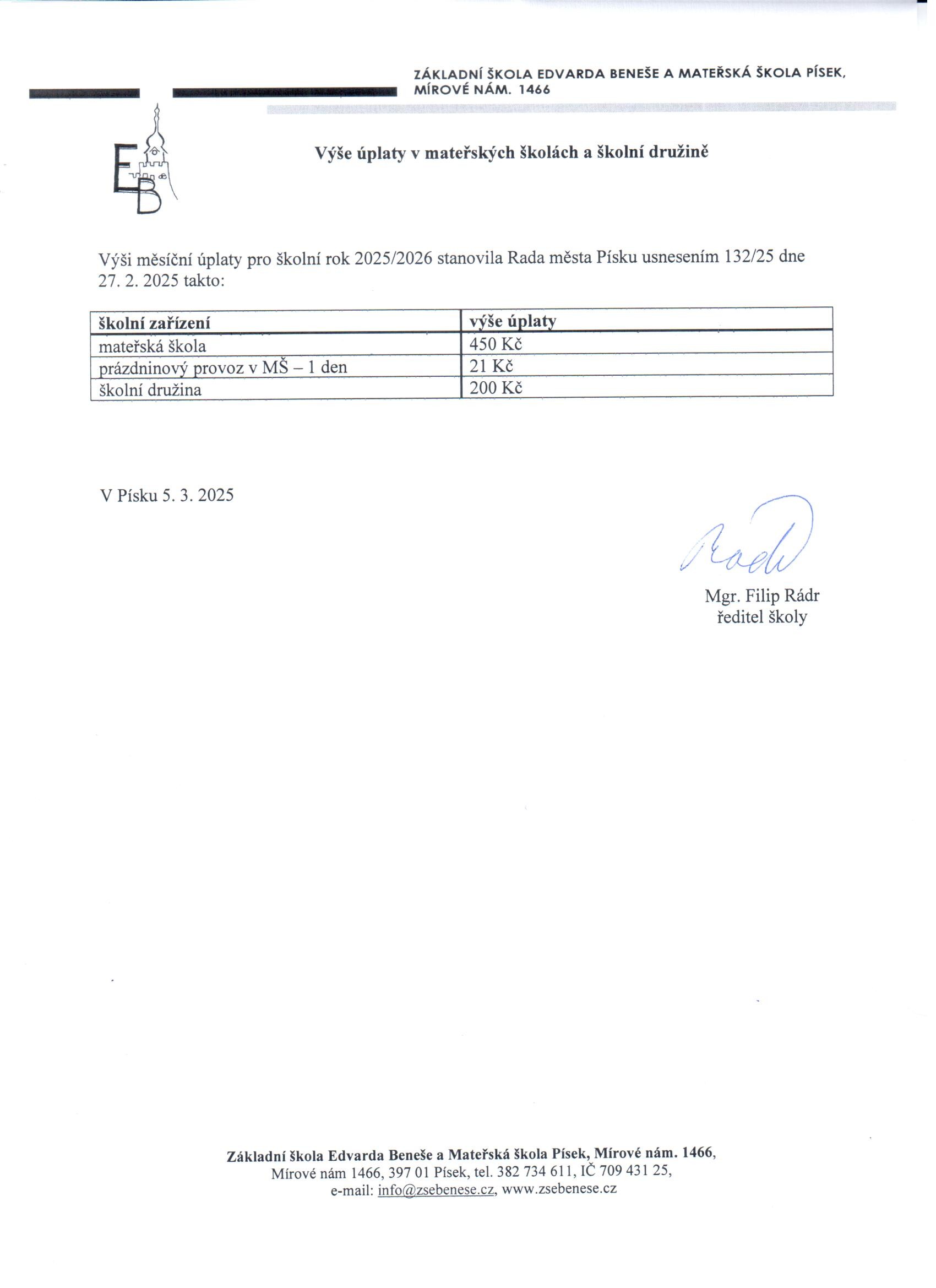 Výše úplaty ve školní družině a MŠ rok 2025/2026
