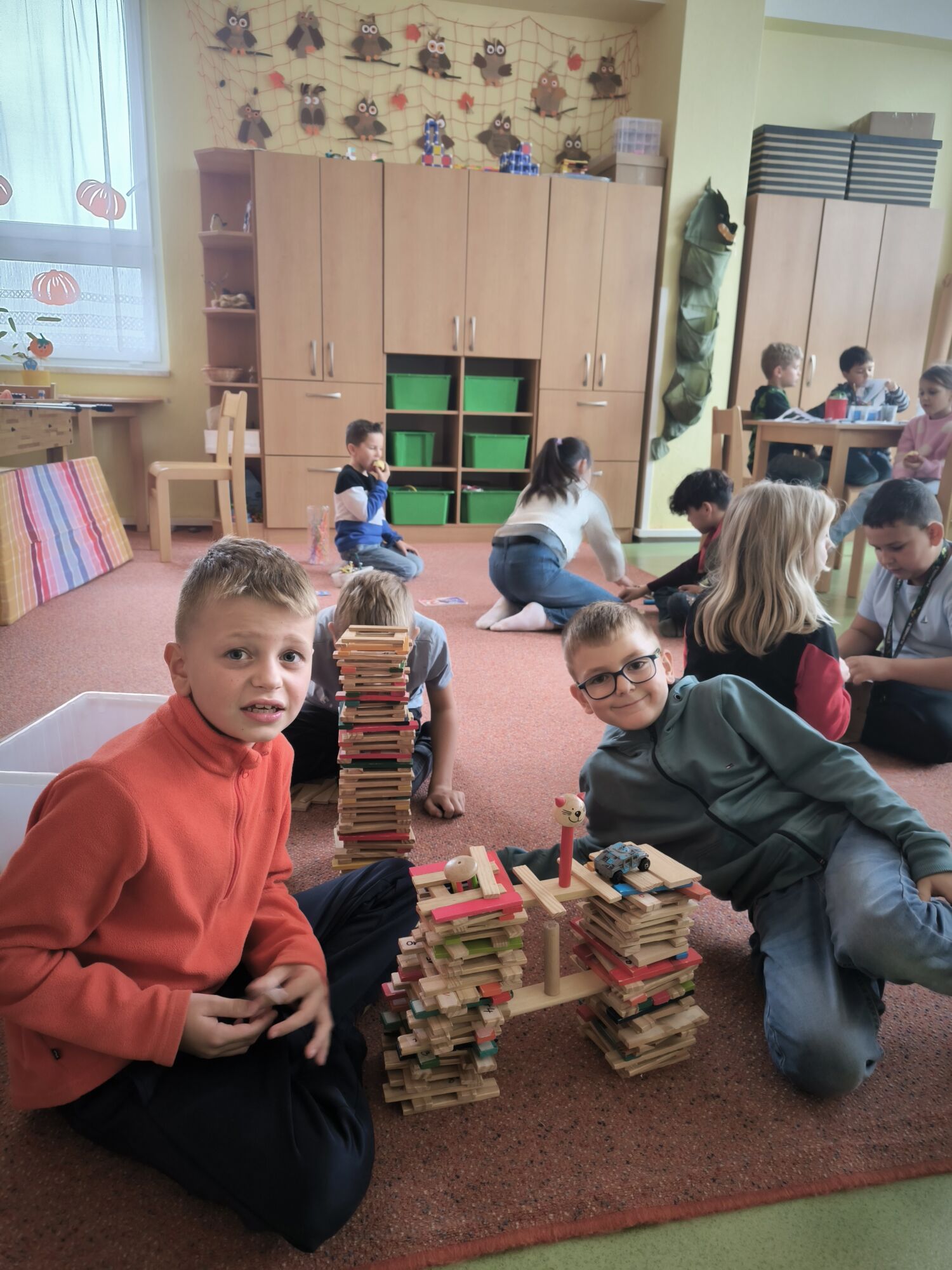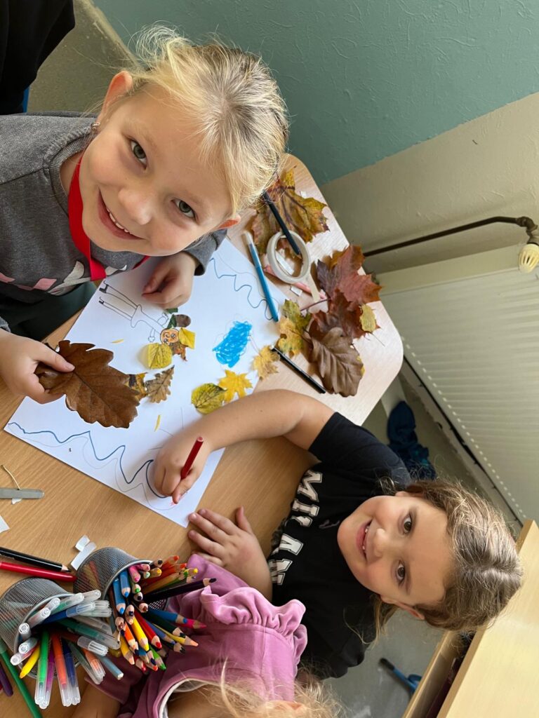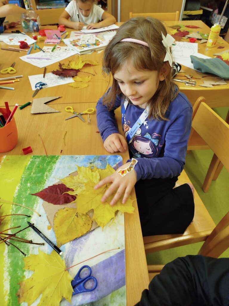 Říjen byl ve školní družině ve znamení podzimní tvořivosti a dobré nálady. Využívali jsme krásné slunečné dny k pobytu venku, kde jsme sbírali listy, kaštany a větvičky. Z nasbíraných přírodnin jsme pak vyráběli různorodé podzimní dekorace – jak venku, tak i v naší družině.