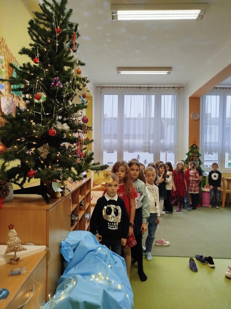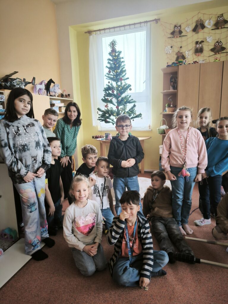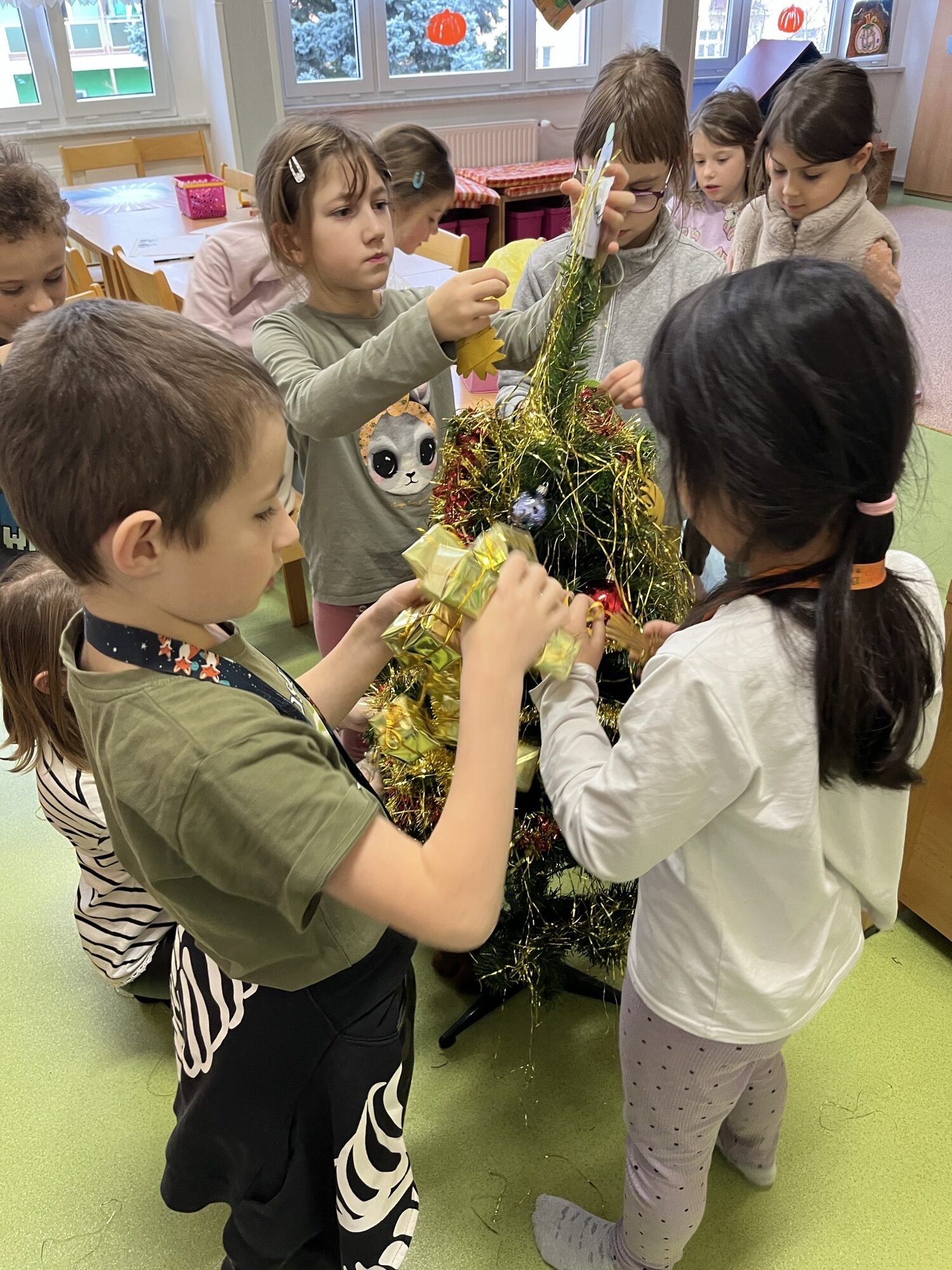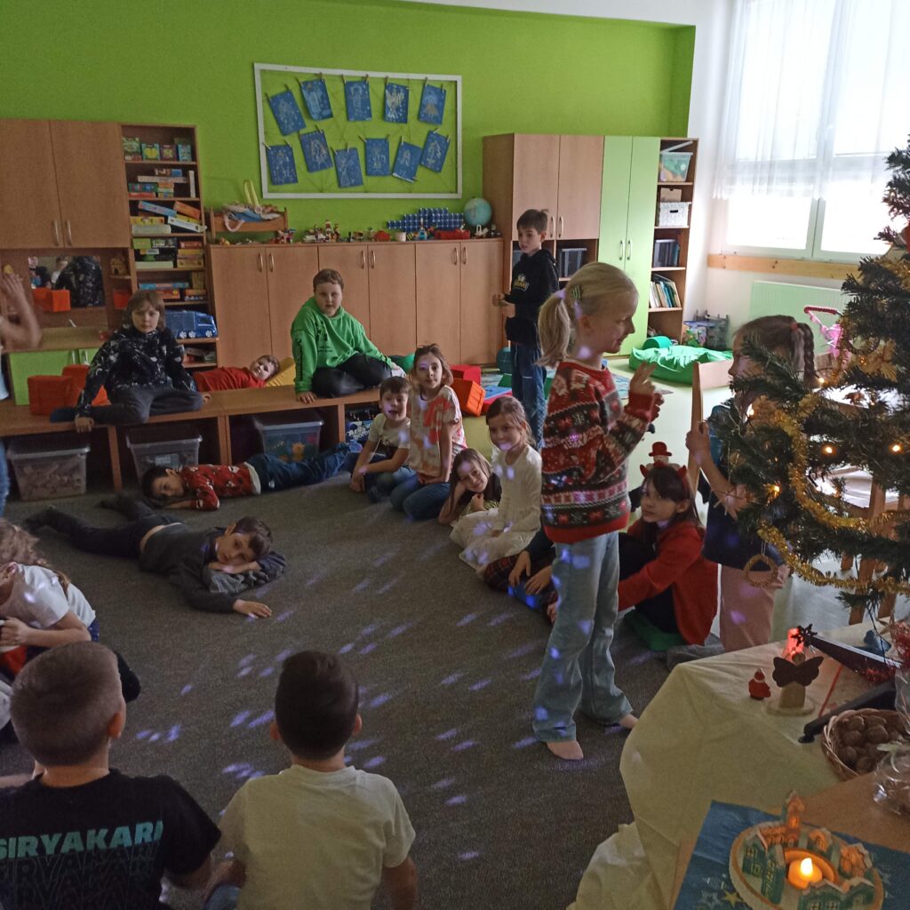 Před školou jsme si prohlédli betlém a vánoční strom, díky nimž jsme se naladili na sváteční čas. Děti s velkou chutí vyráběly vánoční přáníčka a malé dárečky pro své rodiče nebo kamarády, hrály si, pomáhaly s úklidem a zdobením družiny. Nechyběl ani pobyt venku na školním hřišti a společné zpívání vánočních písní.