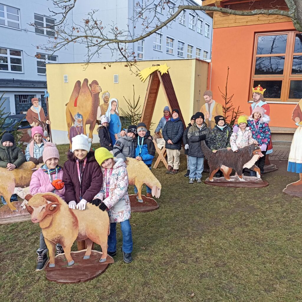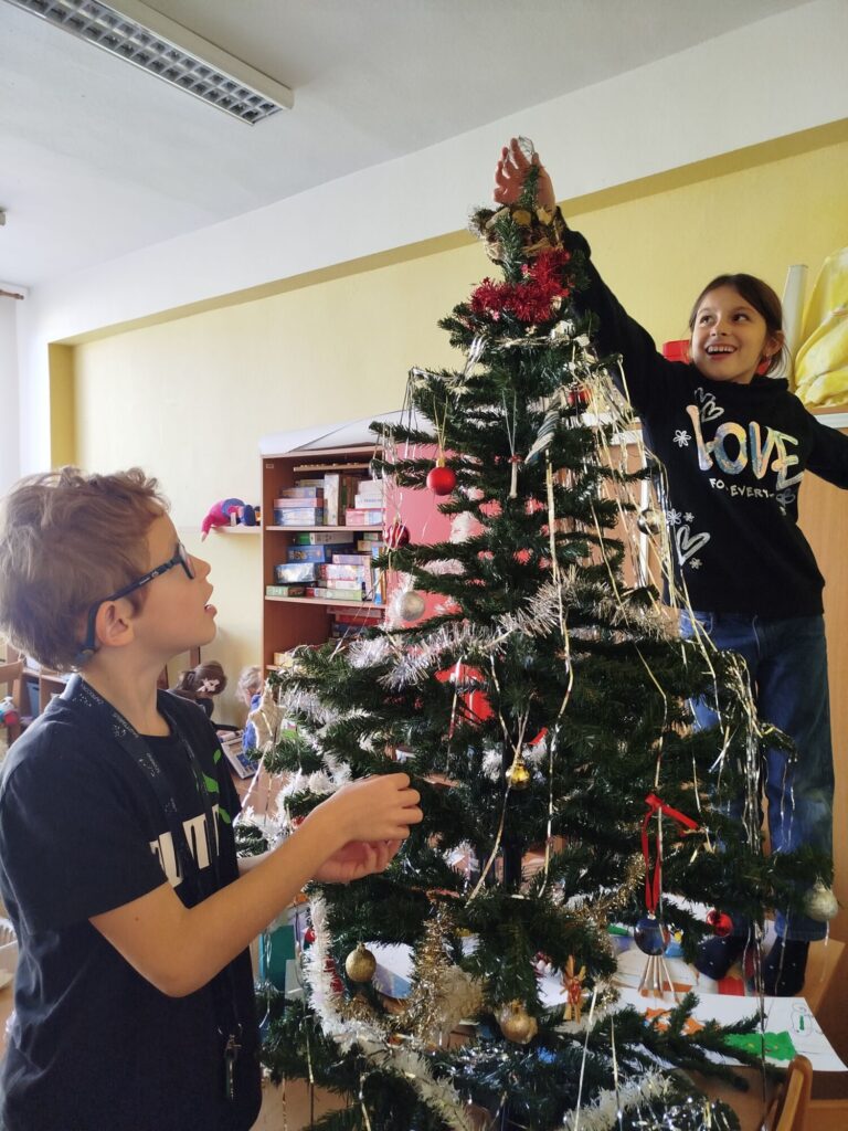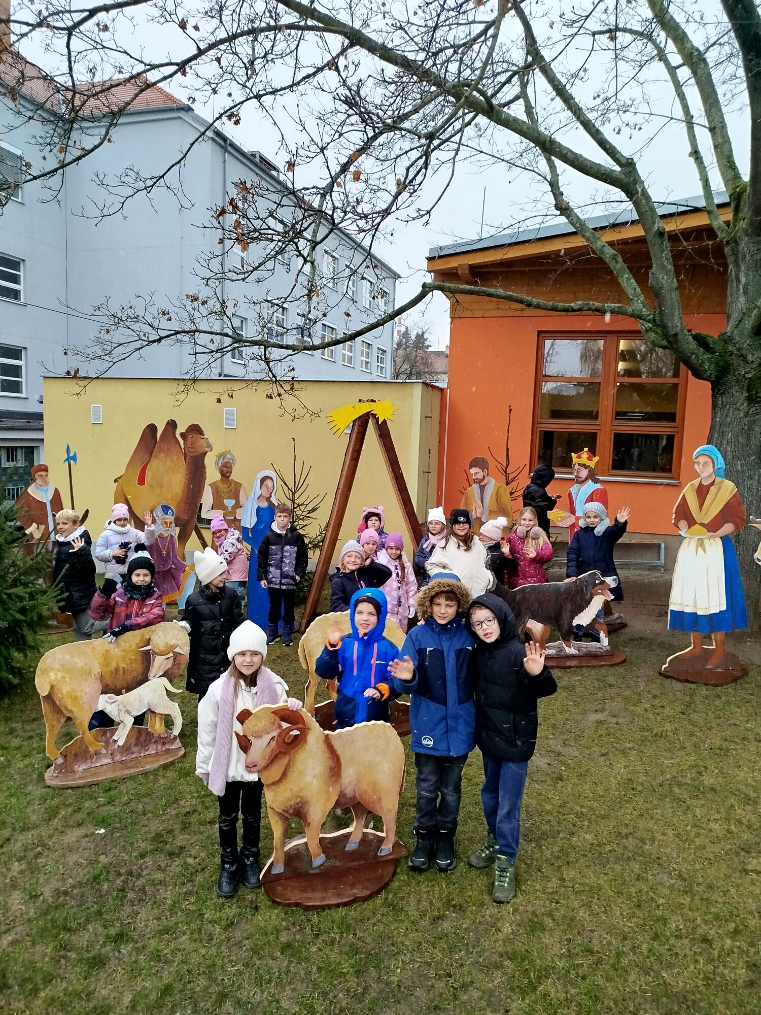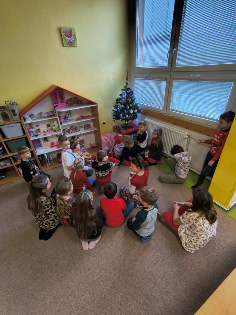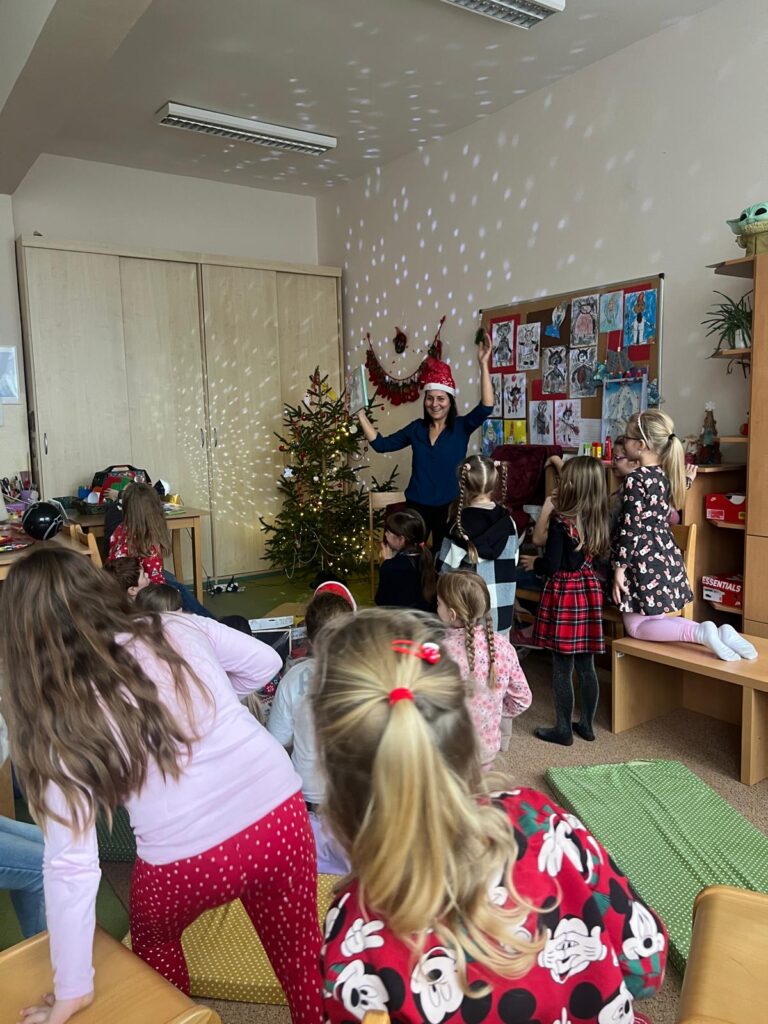 Před školou jsme si prohlédli betlém a vánoční strom, díky nimž jsme se naladili na sváteční čas. Děti s velkou chutí vyráběly vánoční přáníčka a malé dárečky pro své rodiče nebo kamarády, hrály si, pomáhaly s úklidem a zdobením družiny. Nechyběl ani pobyt venku na školním hřišti a společné zpívání vánočních písní.