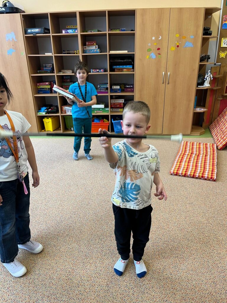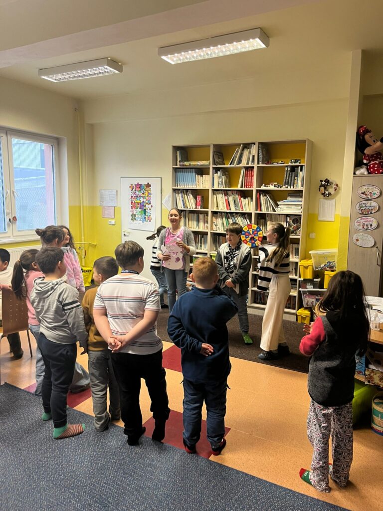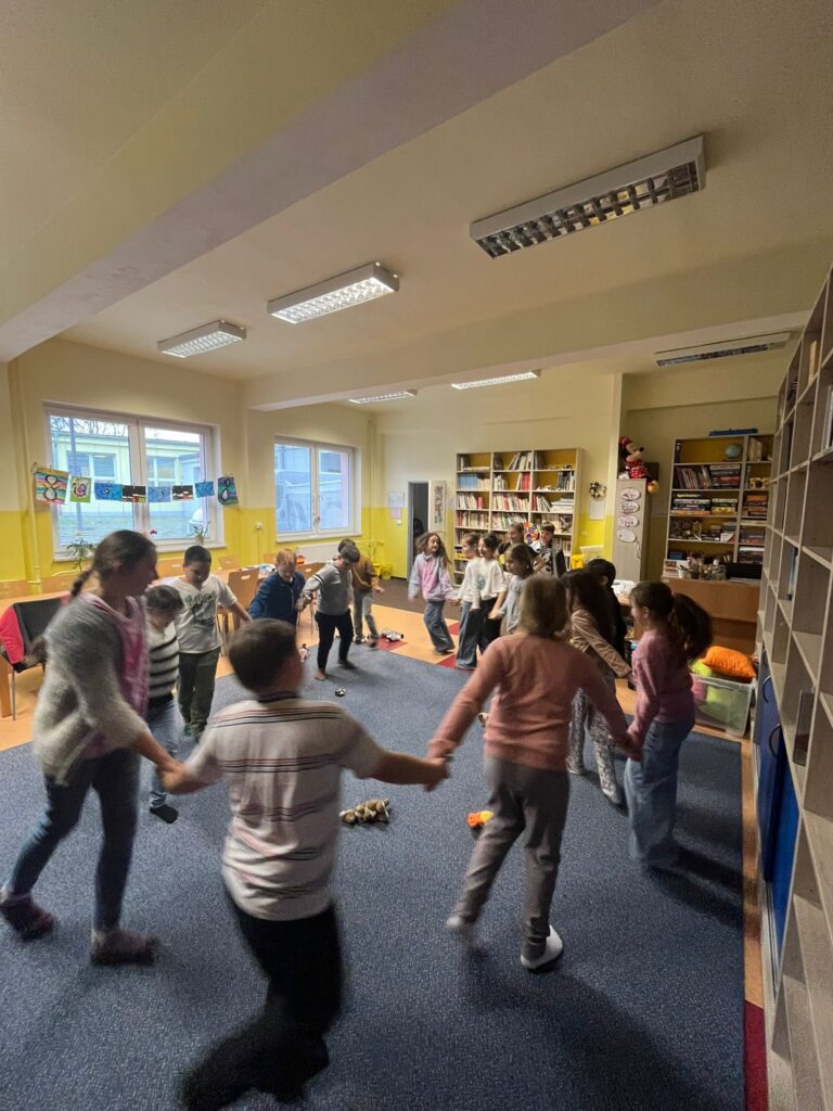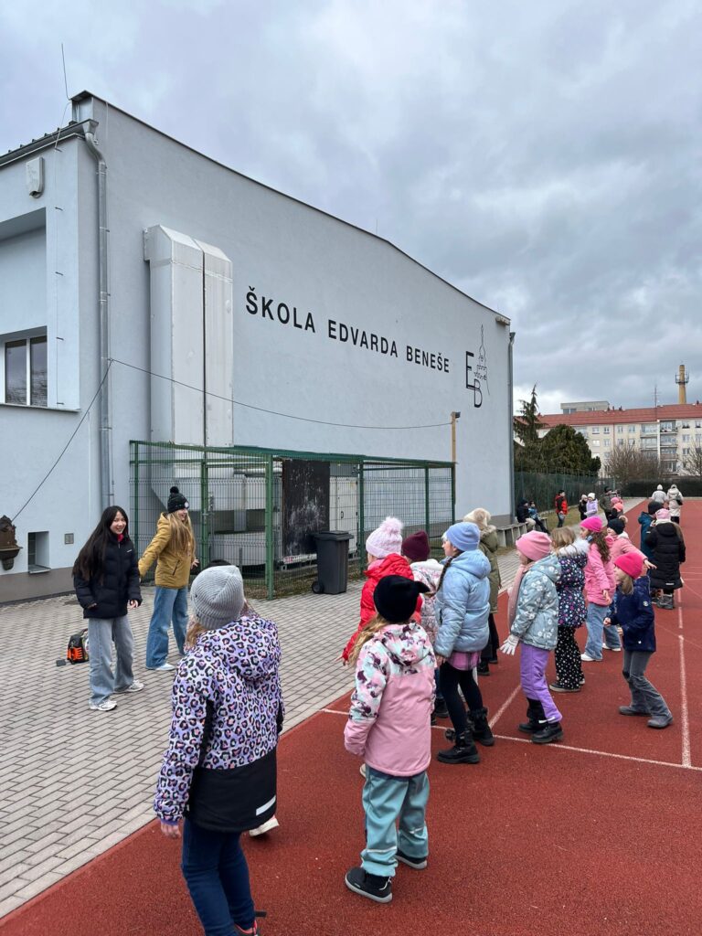 Tomáš, Amálka a Nadiia z 5. třídy se věnovali mladším dětem při společenských i pohybových hrách. Pomáhali, vysvětlovali pravidla a vytvořili příjemnou atmosféru plnou smíchu a spolupráce.
